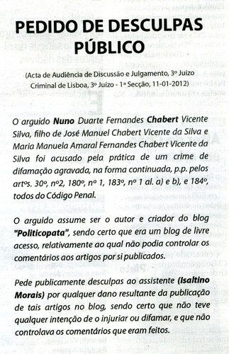 (Ironicamente, muito ironicamente, as desculpas são para Isaltino Morais... )