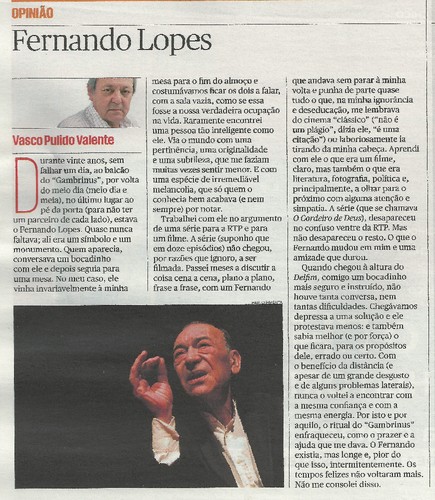 Mas só a trago aqui ao blog porque hoje eu próprio cometo o crime, abaixo jpegado. É certo que o faço em tempo razoável – saiu no Público de ontem, que hoje já não está à venda -, por uma causa maior (a memória de Fernando Lopes), e por conta de um autor amigo (do qual ando atrás, sem sucesso, há semanas – se alguém me puder fornecer o contacto actualizado, ficarei grato...).