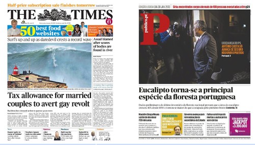 Fará sentido que a fotografia destacada na primeira página do londrino The Times de hoje seja, ainda que proveniente de Portugal (da Nazaré, para ser mais preciso), ignorada na primeira página do seu mais directo semelhante jornal português?