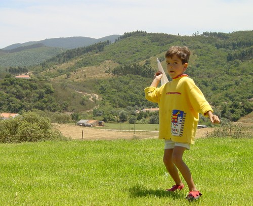 Esta fotografia foi tirada em Maio de 2001, no Alentejo. O meu filho tinha 5 anos, e já fazia aviões de papel. Uma década depois, os aviões de papel ganharam sérias asas e ele voa para bem longe, à procura do seu próprio caminho. Voar é que os pássaros-pais ensinam os pássaros-filhos a fazer.
