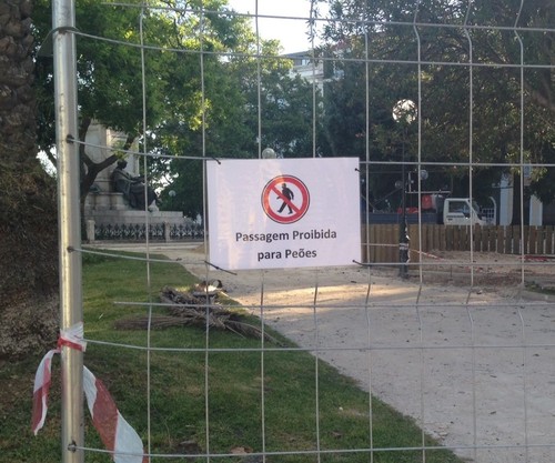 Mas… Mas à boa maneira portuguesa, aqui há dias a praça fechou novamente. Obras à superfície, agora no próprio jardim. Ou seja, obras à vez. Assim voltou a estar fechado o jardim (parece que vai ser alcatroado e a iluminação renovada) seguindo a lógica portuguesa do tapa e destapa. Os senhores do parque fizeram a sua obra, agora estão lá os senhores da câmara. Articularem-se para fazer tudo em simultâneo e prejudicar o menos possível o cidadão? Na, nop, isso eles ainda não aprenderam…